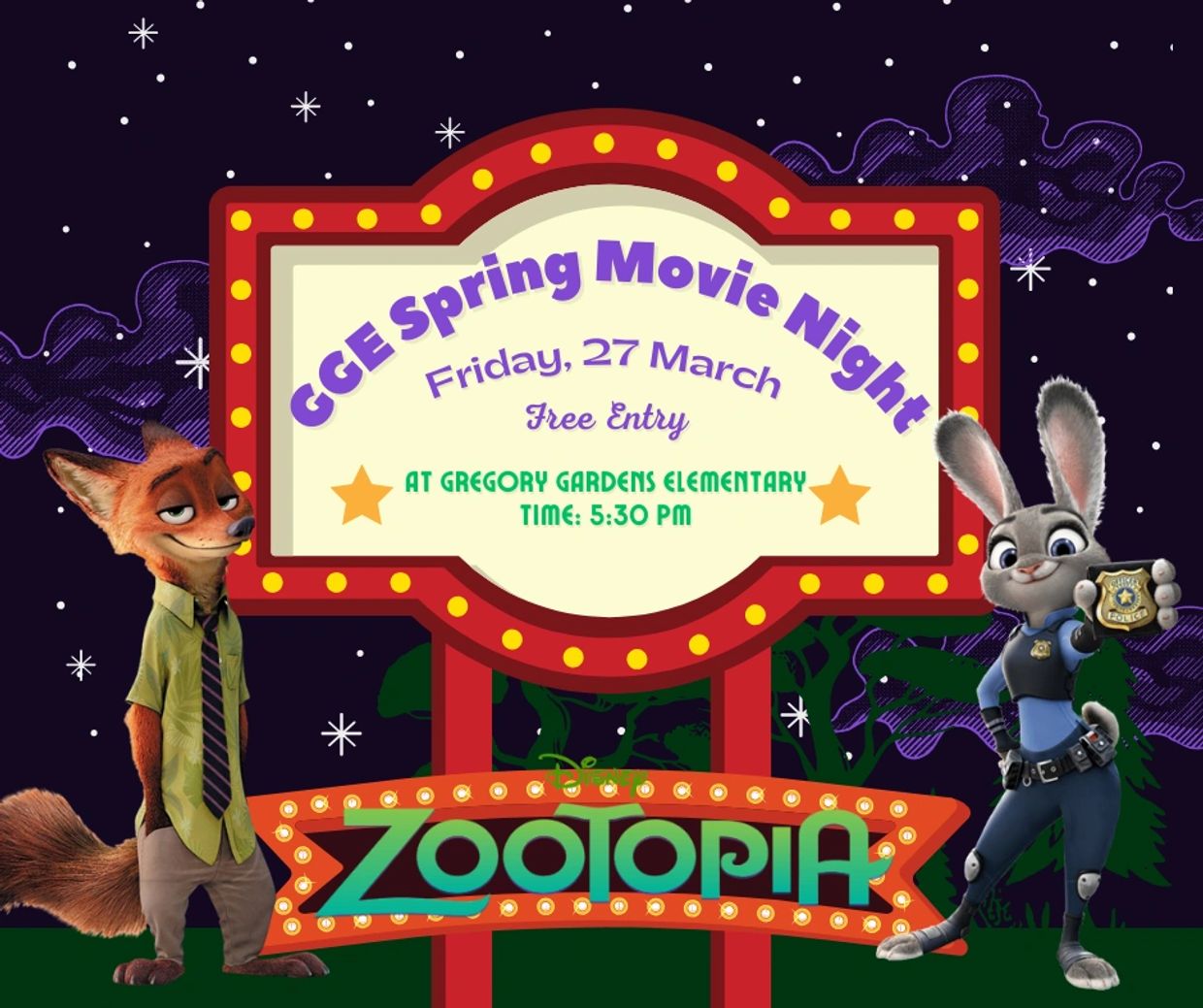 Join us for a fun family evening as we roll out the red carpet and show Zootopia on the big screen for our GGE community!